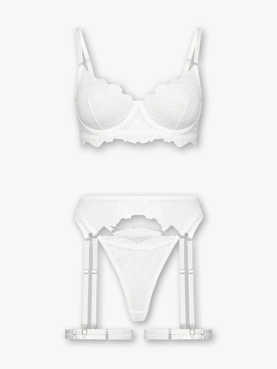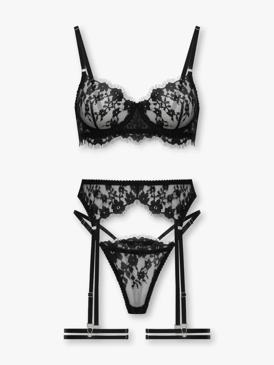 Embrace sophistication and allure with the Ceryna Delia Floral Lace Lingerie Set. Designed to enhance your natural beauty, this enchanting set features intricate floral lace embroidery and decorative straps that create a perfect balance of elegance and sensuality. The underwired bra offers support without padding, providing a flattering, natural silhouette. Paired with a matching thong and adjustable suspender belt with leg straps, this exquisite ensemble is perfect for those moments when you want to feel confident and captivating.
